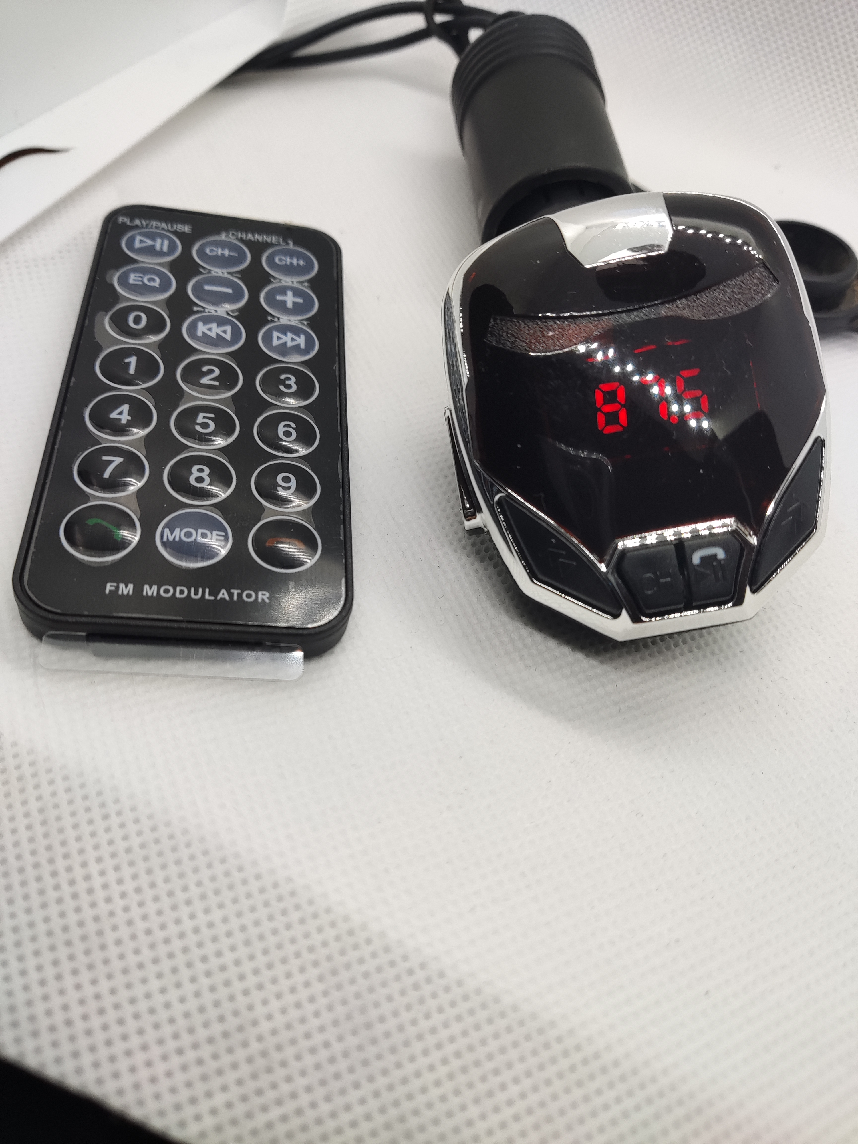 - FM vysílač schopný přehrávat hudbu z přenosných paměťových médií, jako jsou paměťové karty TF