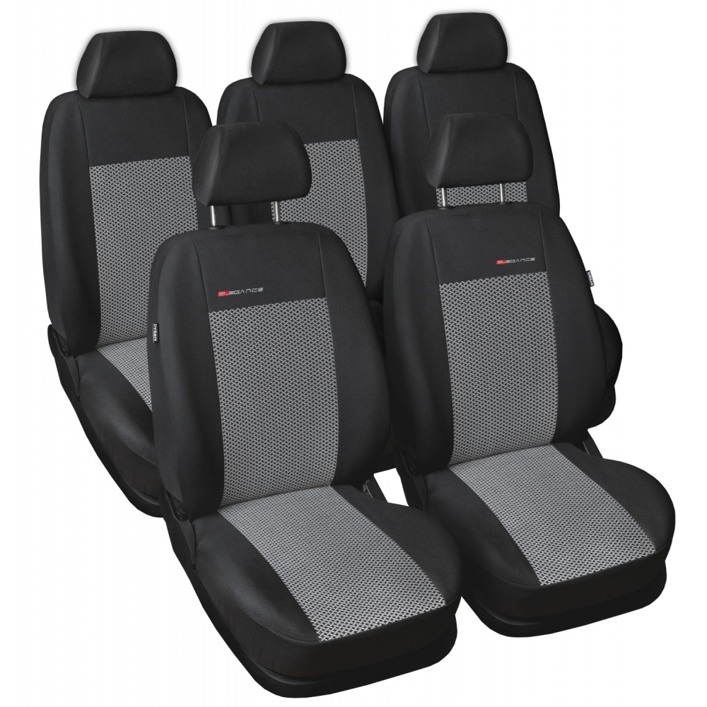 Pět samostatných sedaček, potah na přední loketní opěrku, přípravené otvory pro stolky na předních opěradlech- vhodné pro auta se stolky i bez stolků, 5 opěrek hlavy.